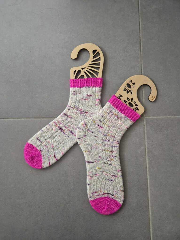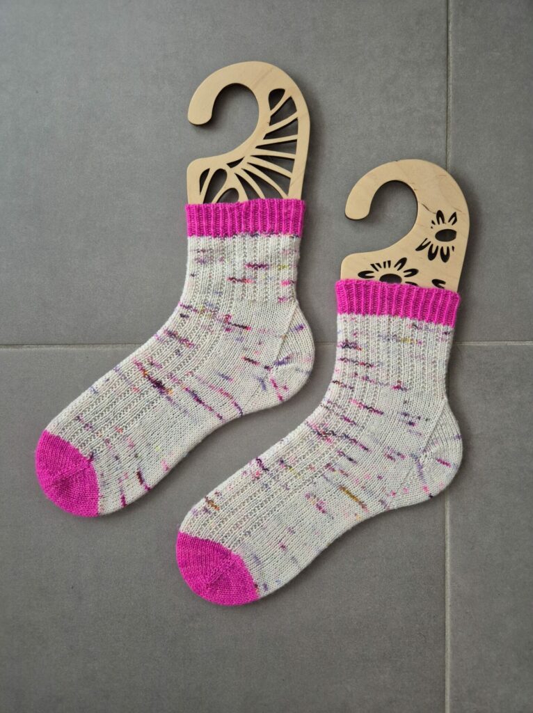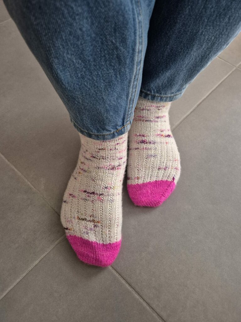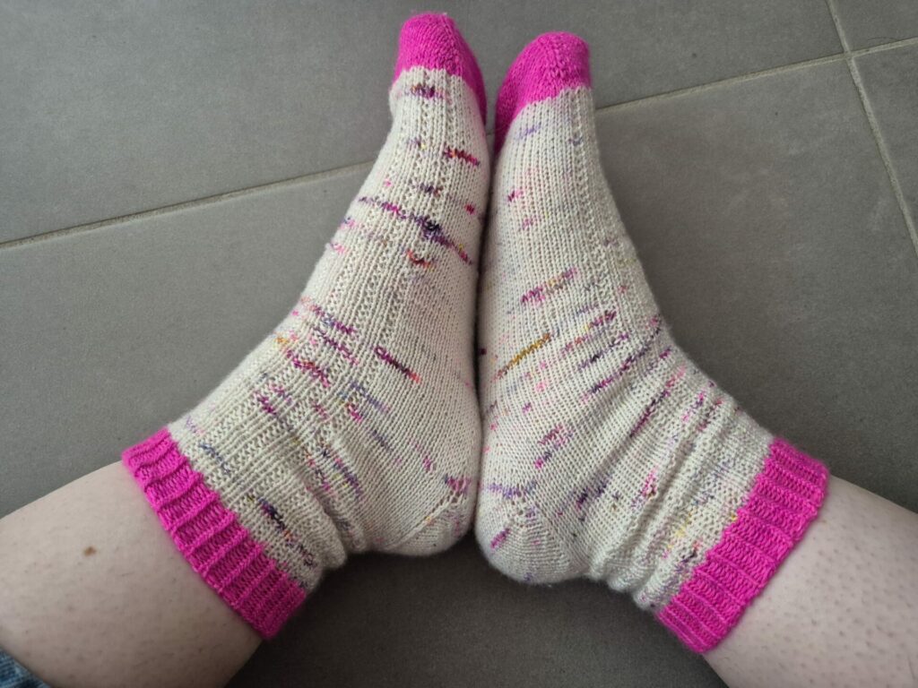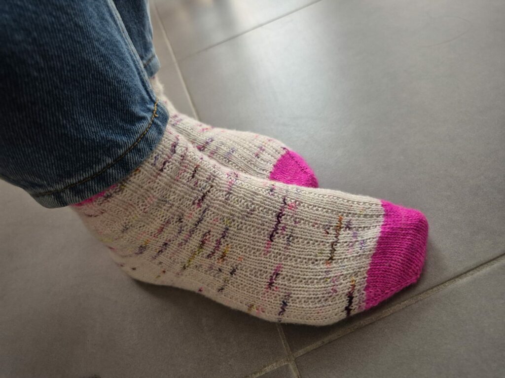 Même s’il m’a fallut très longtemps pour tricoter ces chaussettes, je suis très contente du résultat ! Ce sont des chaussettes avec un coloris joyeux et qui sont très confortables, un vrai plaisir à porter et à montrer ! Le talon proposé est une belle découverte, et j’ai bien envie de m’en tricoter une nouvelle paire un jour.