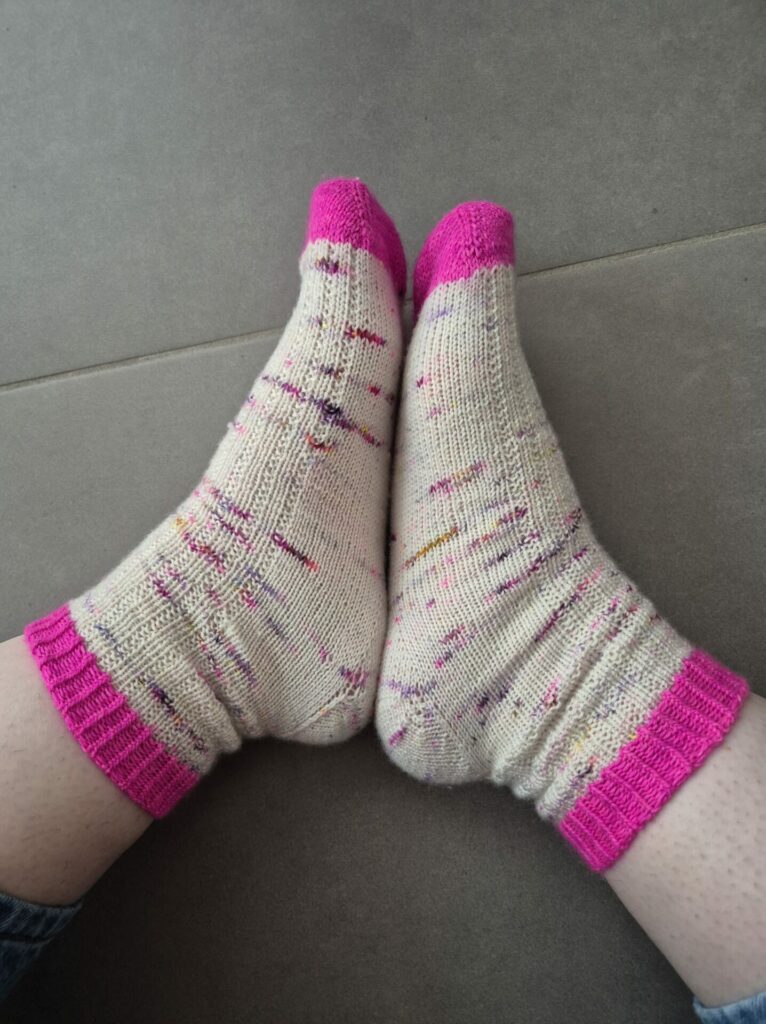 Vous ne vous en souvenez peut-être pas, mais un peu plus tôt dans l’année, je vous avais montré les chaussettes Toutouyoutou que j’ai tricotées pour ma maman. C’est elle qui avait choisi le magnifique coloris principal chez Une Maille à la fois lors d’un salon, et j’avais rajouté un joli contrastant bien rose. J’étais très contente de ce choix de couleurs et, bonne nouvelle, ma maman n’a pas des très grands pieds. Il me restait donc assez de laine pour me faire une paire pour moi aussi avec cette même combinaison de rose !