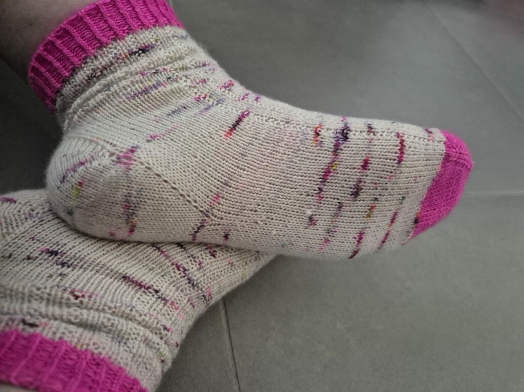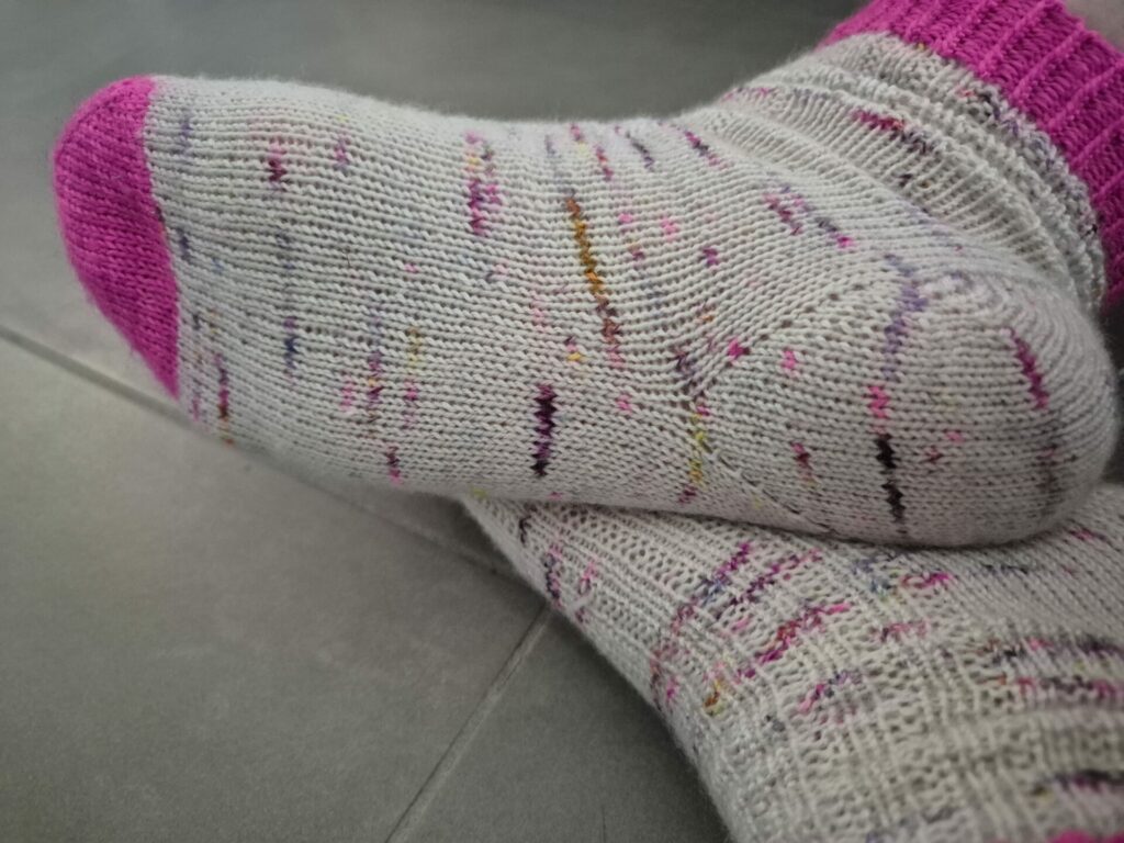 C’est finalement cet été que j’ai réussi à trouver la motivation pour terminer ces chaussettes. Mais j’ai été souvent un peu trop pressée, et j’ai fait beaucoup d’erreurs d’inatention qu’il a fallu détricoter. Et comme je le disais un peu plus haut, quand on tricote les deux chaussettes en même temps, tout prend plus de temps. J’ai aussi découvert pour la première fois ce nouveau talon, qui est très confortable. Mais il a aussi nécessité quelques ajustements pour la longueur à garder pour le talon par rapport à mes habitudes.