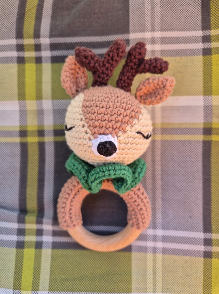 Puis on ajoute les détails (museau et broderie des yeux). Ensuite, on ajoute les oreilles et les bois (qui sont crochetés en deux morceaux). Enfin, on crochète le col à volant directement sur le bas de la tête, puis on crochète la bande qui permet de fixer le cerf à l’anneau de dentition.